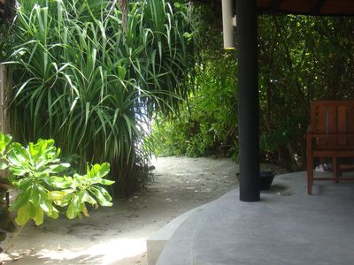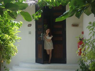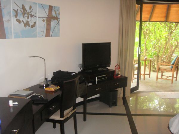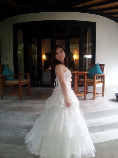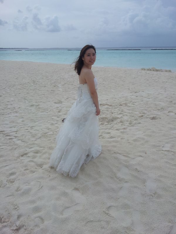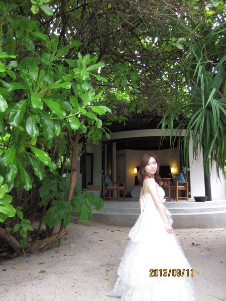 第二天,天不亮就兴奋的起床了,因为带了漂亮的婚纱,想顺便拍一下于是趁着小Q还在赖床,赶紧洗漱起来。从门口拍,一路拍,一直拍到海边,早上8点多,好像大家都没起床呢,沙滩上竟然都没有人。后来才发现,好像到了吃饭时间大家就都蹦出来了,其他时间,真是人迹罕至啊。拍完婚纱,再次收拾行装去吃早饭,感觉一天下来除了吃饭就是拍照,间隙再换衣服。其实早晚餐真是够了,早餐可以吃到10:00,晚餐18:00就开始了,如果运动量不大的话,带点零食足以。午餐归来,懒懒的再凉亭休息一会,喝喝下午茶,换起比基尼,向着大海出发啦!我们第一天就租了潜水设备,免费的,倒数第二天下午6点前去还就可以了。我在沙滩的躺椅上晒着太阳,小Q就迫不及待背着设备下水了。说实话,伊露的浮潜不好,可能是人工痕迹太重,浅水区都没有什么鱼,好多的珊瑚尸体还扎脚,就是沙子很棒,长长的白沙滩很美,被海水打碎的珊瑚便成了这篇沙滩。